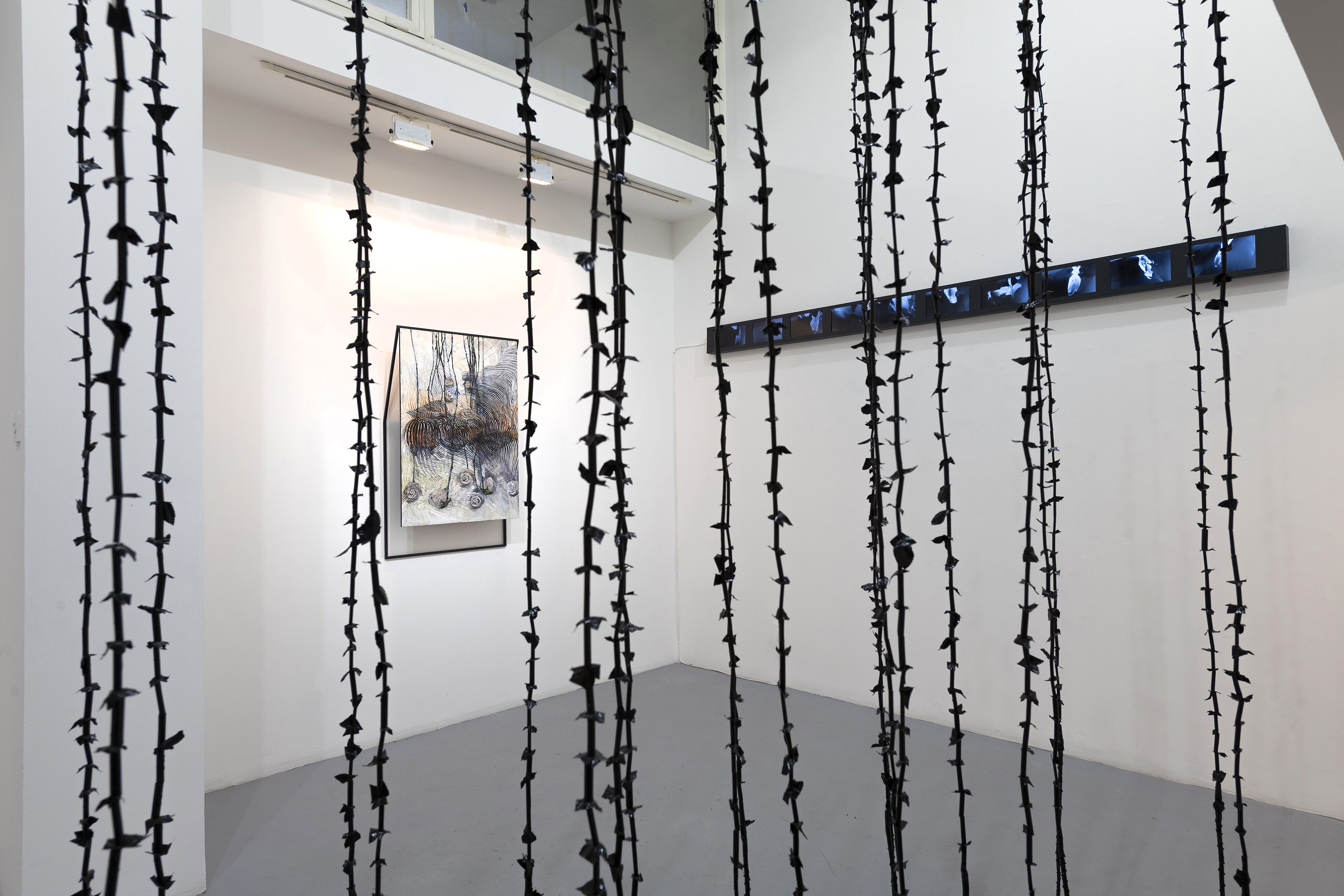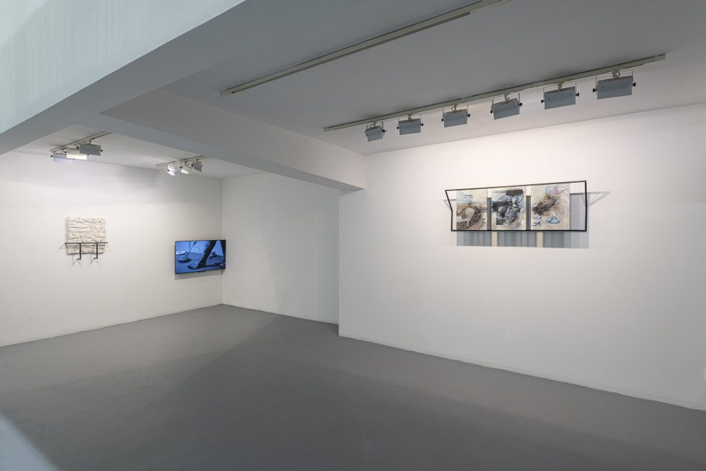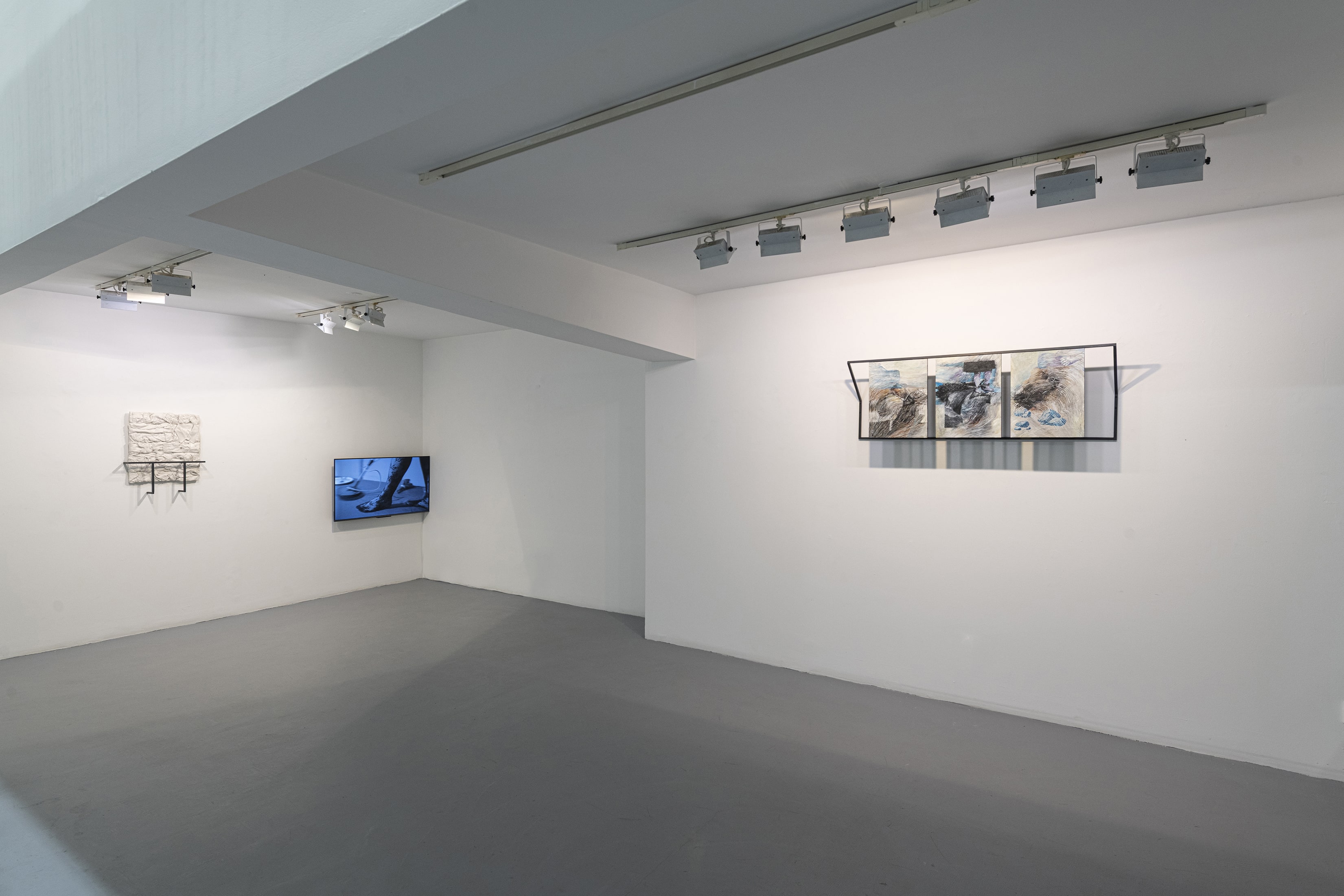 Στους τοίχους, τα Anatomy of Cells (2025) και Graviton I–III (2025) εισάγουν διαφορετικές εκδοχές ύλης και εγγραφής. Τα εκμαγεία από αλάβαστρο, ενδύματα απολιθωμένα σε γλυπτική μορφή στο Anatomy of Cells αφήνουν την απουσία να διαφαίνεται μέσα στην ύλη του παρόντος. Το λευκό τους συγχωνεύεται με την αρχιτεκτονική, μεταμορφώνοντας τη μνήμη σε δομή. Απέναντί τους, τα Graviton I–III μεταγράφουν αυτή τη στασιμότητα της ύλης σε δόνηση. Τα σχέδια λειτουργούν ως επιφάνειες συντονισμού και όχι αναπαράστασης· κάθε χάραξη καταγράφει το ίχνος μιας μετακίνησης, το υπόλειμμα μιας πράξης και όχι την απεικόνισή της. Η γραμμή λειτουργεί ως μέτρο αστάθειας, ως χαρτογράφηση μιας κατεύθυνσης υπό διαγραφή, μια αισθητική που δεν απεικονίζει την κίνηση αλλά την παράγει.