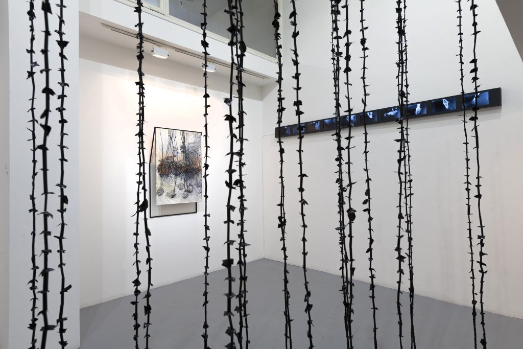 In the central space, the video Homefront (2025) functions as a point of transition and pause. The projection, positioned a few centimeters away from the wall, creates a slight gap that destabilizes the viewer’s perspective, introducing a sense of uncertainty between the real and the projected. Within the video, the domestic interior–a place of safety par excellence–is transformed into a field of exception, where care and threat coexist and interpenetrate. A woman, visible only from the knees down, moves through the house with a mine detector, revealing the invisible tensions that lie beneath the surface of everyday life, tracing an unstable horizon across the physical terrain of the home. The act of “demining” becomes a gesture of critical vigilance, a metaphor for the fragility of the familiar and the delicate balance between safety and disorientation.
