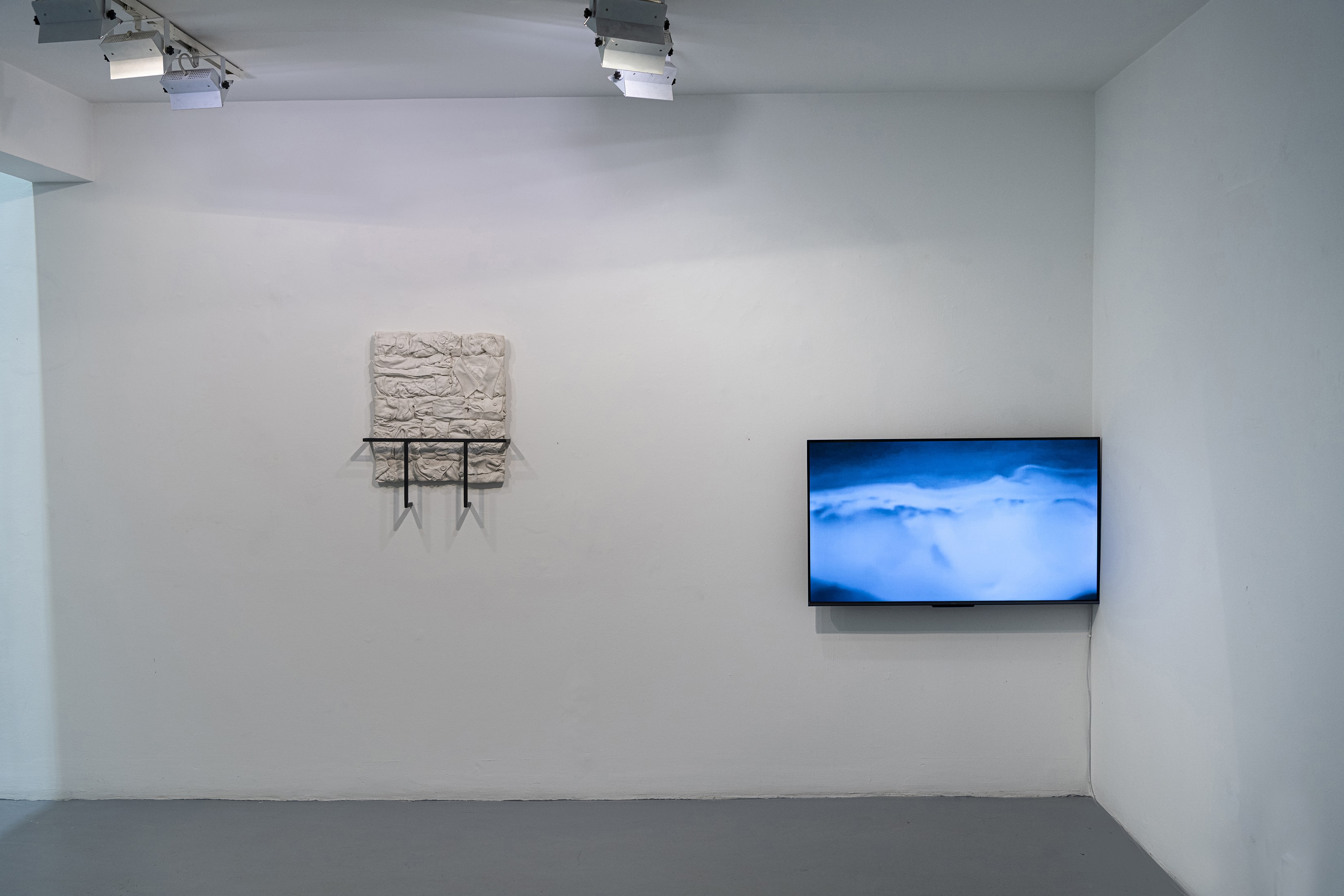 On the walls, Anatomy of Cells (2025) and Graviton I–III (2025) introduce different versions of matter and inscription. The alabaster casts, garments fossilized into sculptural form, allow absence to appear through the materiality of the present. Their whiteness merges with the architecture, transforming memory into structure. Opposite them, Graviton I–III translates this stillness of matter into vibration. The drawings function as surfaces of resonance rather than representation; each incision records the trace of a movement, the residue of an action rather than its depiction. The line operates as a measure of instability, as a mapping of a direction under erasure, an aesthetic that does not depict movement but produces it.