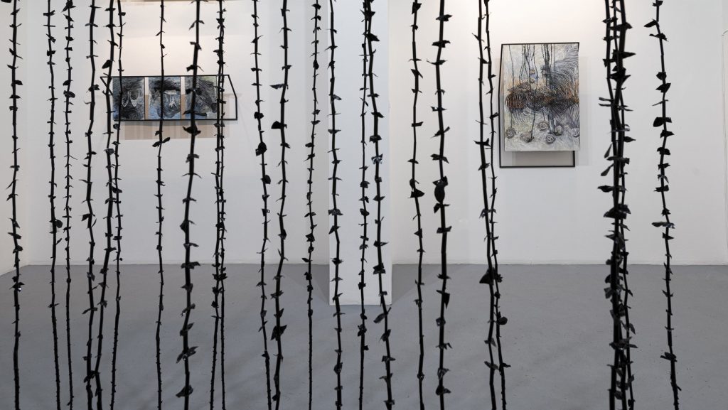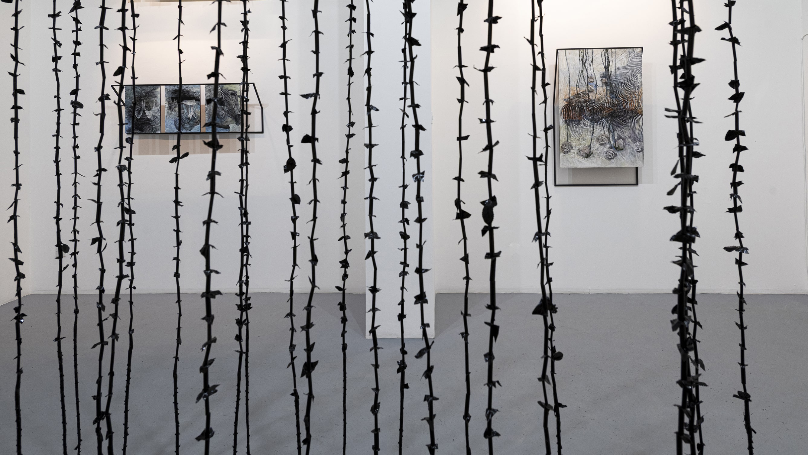 Following this path, The Creepers (2025) shapes the first material coordinates of the exhibition field: a cluster of marble, inverted roses gently rests on the floor, introducing the paradox of endurance and decay that permeates the entire visual proposal. Their downward orientation denies the logic of ascension and transcendence, insisting on gravity as a form of continuity. Here, Antoniou establishes a form of resistance that is not confrontational; a quiet persistence that reimagines resilience not as an act of heroism, but as a sustained condition shaped by time.